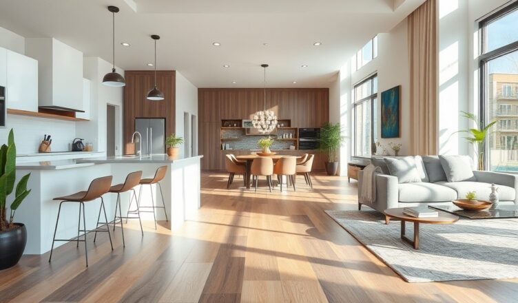 Jak zaplanować łączenie różnych materiałów podłogowych między kuchnią a salonem?